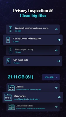 Reclaim storage space with our intelligent cleaner. Our powerful cleaner efficiently help to removes unneeded files like log, apk, empty folders and more, Indulge in a streamlined experience with just a tap.