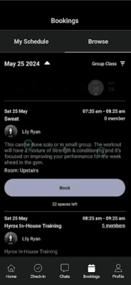 View trainer profiles and at your health facility and match the best fit for you. Book in though the app and schedule a training session or consultation.
