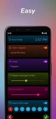 This app is designed to help people with disabilities get their bearings from events during the day. You create an alarm with a phrase, for example "Remedy time", then, at the set time, the app speaks the chosen phrase.